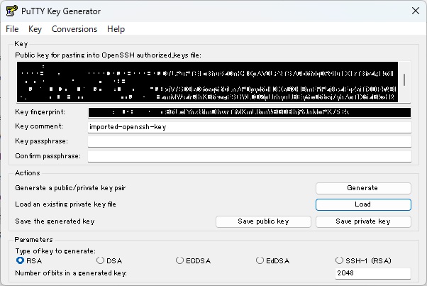 load で id_rsa を読み込み Save private key で .ppk ファイルを得る